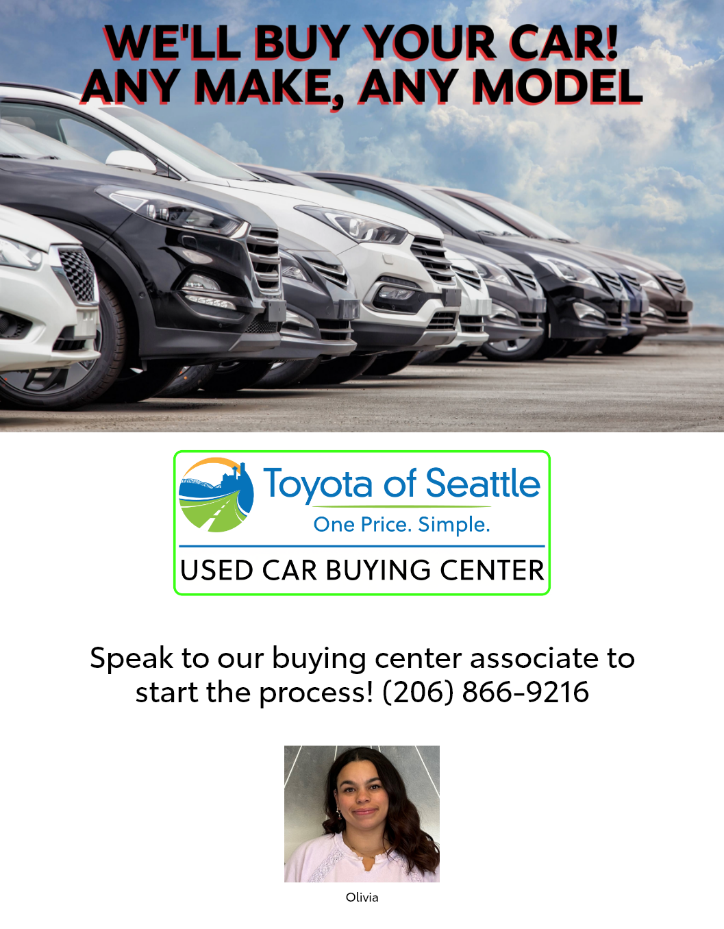 At Toyota of Seattle, we make the process of selling your used car simple, transparent, and hassle-free. Whether you're upgrading, downsizing, or just ready for a change, our Used Car Buying Center is here to help.